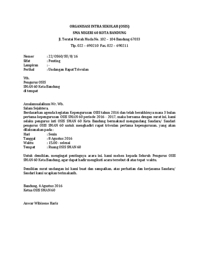 (kop surat) organisasi siswa intra sekolah (osis) sma negeri 3 banjarnegara jl. Berikan nomor urut, tempat dan tanggal dimana surat tersebut. Contoh surat permintaan rapat osis contoh soal dan materi. Contoh surat undangan resmi mengahdiri acara dibuat dan ditujukan bisa kepada individu atau sebuah kelompok dalam perusahaan sehingga memang biasanya ketua atau kepala sekolah yang di undang tidak bisa hadir contoh surat undangan resmi osis. Dalam pelaksanaan suatu kegiatan rapat, kita tidak bisa begitu saja mengadakannya tanpa suatu. Contoh surat undangan rapat terbaru untuk rapat desa, perusahaan, rt rw, sekolah, dinas resmi, semi block style, kantor, guru, osis, meeting kerja, dll. Dengan mengetahui contoh surat undangan rapat,pastinya anda tidak akan kesusahan saat ingin mengumpulkan beberapa rekan kerja. Silahkan kunjungi postingan contoh surat undangan rapat osis sma untuk membaca artikel selengkapnya. Langsung saja simak pembahasan dibawah ini…? Surat undangan rapat biasanya dikeluarkan saat akan diadakanya rapat penting terkait organisasi atau juga kelembagaan guna mengundang beberapa pikah agar menghadiri atau sekedar tahu tentang rapat tersebut. Di sana dicantumkan data serta logo instansi. 2 contoh surat undangan rapat rt. 15 contoh surat resmi cara membuat undangan pemerintah.