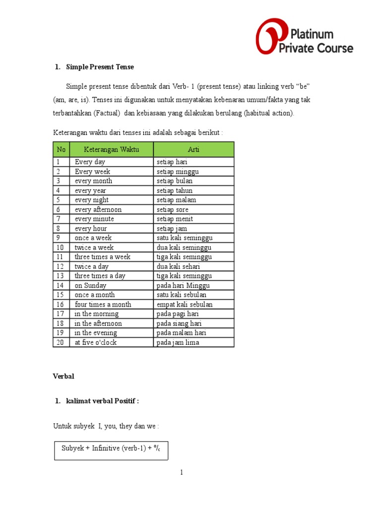 Kalimat nominal (nominal sentence) dan kalimat verbal (verbal sentence) juga merupakan salah satu dari pembagian kalimat tersebut. I, you, they, we + verb tanpa 2. Dalam artian bahwa yang menerangkan subjek adalah kata kerjanya. Berikut adalah contoh kalimat verbal dan nominal simple present tense. Rumus & contoh kalimat 16 tenses dalam bahasa inggris. Simple present tense digunakan untuk membicarakan rencana atau jadwal di masa depan namun memiliki jangka waktu dekat dengan sekarang. Supaya lebih mudah dihafal, cobalah untuk membuat sebuah percakapan misalnya percakapan tentang menunggu bus dalam bahasa inggris yang dilakukan dengan 2 orang teman di kelas. Tense adalah bentuk kata kerja dalam bahasa inggris untuk menunjukkan waktu (sekarang, masa depan, atau masa lalu) categories verb & verbal tags tenses bahasa inggris. I study english for two hours every day. Untuk lebih jelas mari kita simak paparan berikut ini Berbeda dengan nominal, kalimat verbal merupakan sebuah aturan linguistik dalam bahasa inggris yang mengandung kata kerja, dengan kata lain perdiket pada kalimat verbal adalah verb. Posted in grammar, uncategorizedtagged arti kalimat, bentuk kalimat dalam bahasa inggris, contoh kalimat bahasa inggris, contoh kalimat past tense nominal, contoh kalimat present tense nominal, contoh. Kedua jenis kalimat ini ada pada semua tenses.